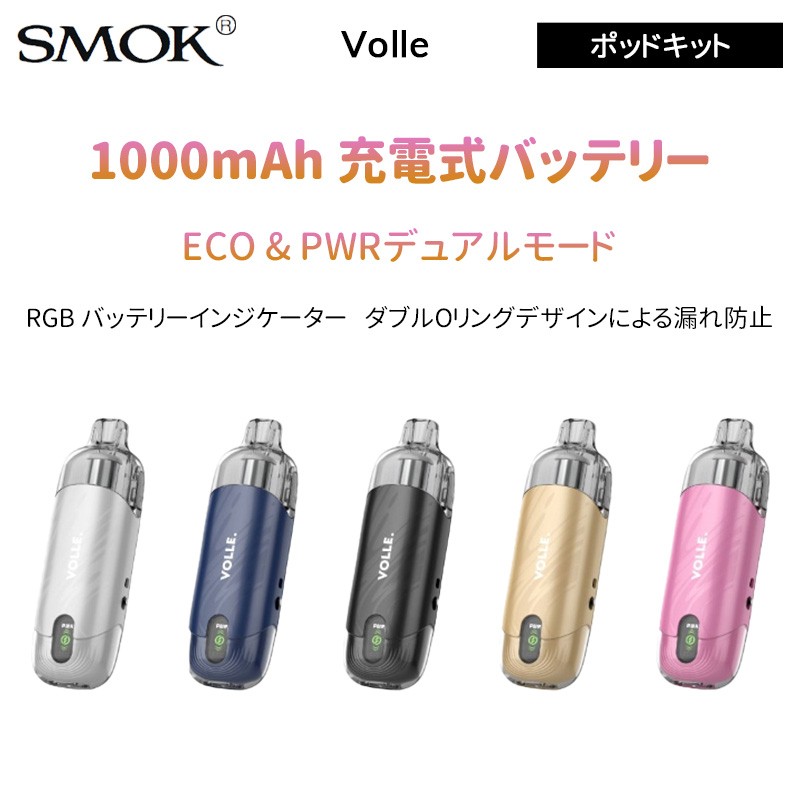 SMOK Volle は、使い捨てスタイルのシンプルさと再利用可能なデバイスの柔軟性を兼ね備えたユーザー向けに設計されているポッドキットです。1000mAhの大容量バッテリーとUSB TYPE-C急速充電を搭載し、短時間での充電と長時間の使用が可能です。ECOとPOWERの2つの出力モードがあり、ユーザーは個人の好みに応じて蒸気の量を調整し、必要に応じて高効率モードまたはより強い吸引抵抗を選択できる。10mlの大容量リキッドを搭載したこの詰め替え可能なポッドカートリッジは、ベイピング時間を大幅に延長。また、お好みのフレーバーに合わせてシングルとデュアルのメッシュコイルオプションを提供、いろいろなニーズを満足できる。SMOK Volleには、バッテリーの状態を異なる色で表示するRGBインジケーターを備えて、グリーンはバッテリーレベルが 50% ~ 100% であることを示す。ブルーは 10% ~ 50%、レッドは 0% ~ 10% 。さらに、ダブルOリングデザインにより、漏れる心配は全くない。SMOK Volle ポッドキットで、快適で自由なVAPEライフをお楽しみください!