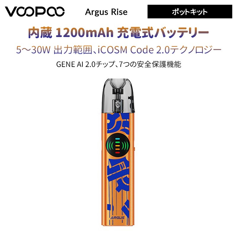 VOOPOO Argus Rise ポットキットは、高性能・利便性・スタイリッシュなデザインを兼ね備えたデバイスです。強力な1200mAh内蔵バッテリーとType-C 急速充電を搭載。短時間で充電が完了し、長時間の使用が可能です。面倒な頻繁な充電から解放される。また、5~30Wの出力範囲を提供し、いろいろなべイプニーズを満足できる。VOOPOO Argusシリーズのほとんどのポッドカートリッジに対応しており、3mlのリキッド容量を備えて、長時間の使用をサポート。独自のサイドフィル設計により、簡単で漏れにくい充填が可能です。新型iCOSM CODE 2.0テクノロジを採用し、30日間にわたる液漏れ知らずのクリーンな使用感、安定したフレーバー、そして100mL相当の長寿命体験を実現。吸いごとに滑らかで安定したフレーバーをお楽しみいただけます。さらに、GENE AI 2.0チップは、より安定した電力出力、精確な状況認識、そして電光石火の応答速度により、強化されたパフォーマンスを実現。VOOPOO Argus Rise ポットキットは初心者から上級者まで、どなたでも満足できる一台です!